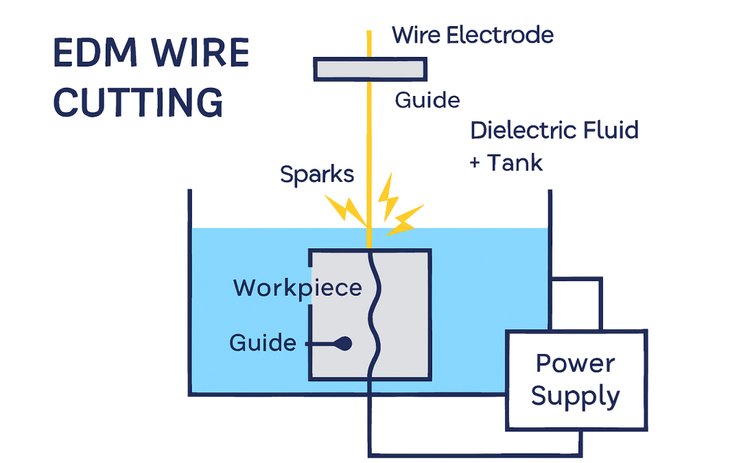 EDM stands for Electrical Discharge Machining. Wire cutting is a specialized form of EDM where a thin wire acts as the electrode. By passing electrical discharges between the wire and the workpiece, material is eroded with extreme precision—without physical contact.